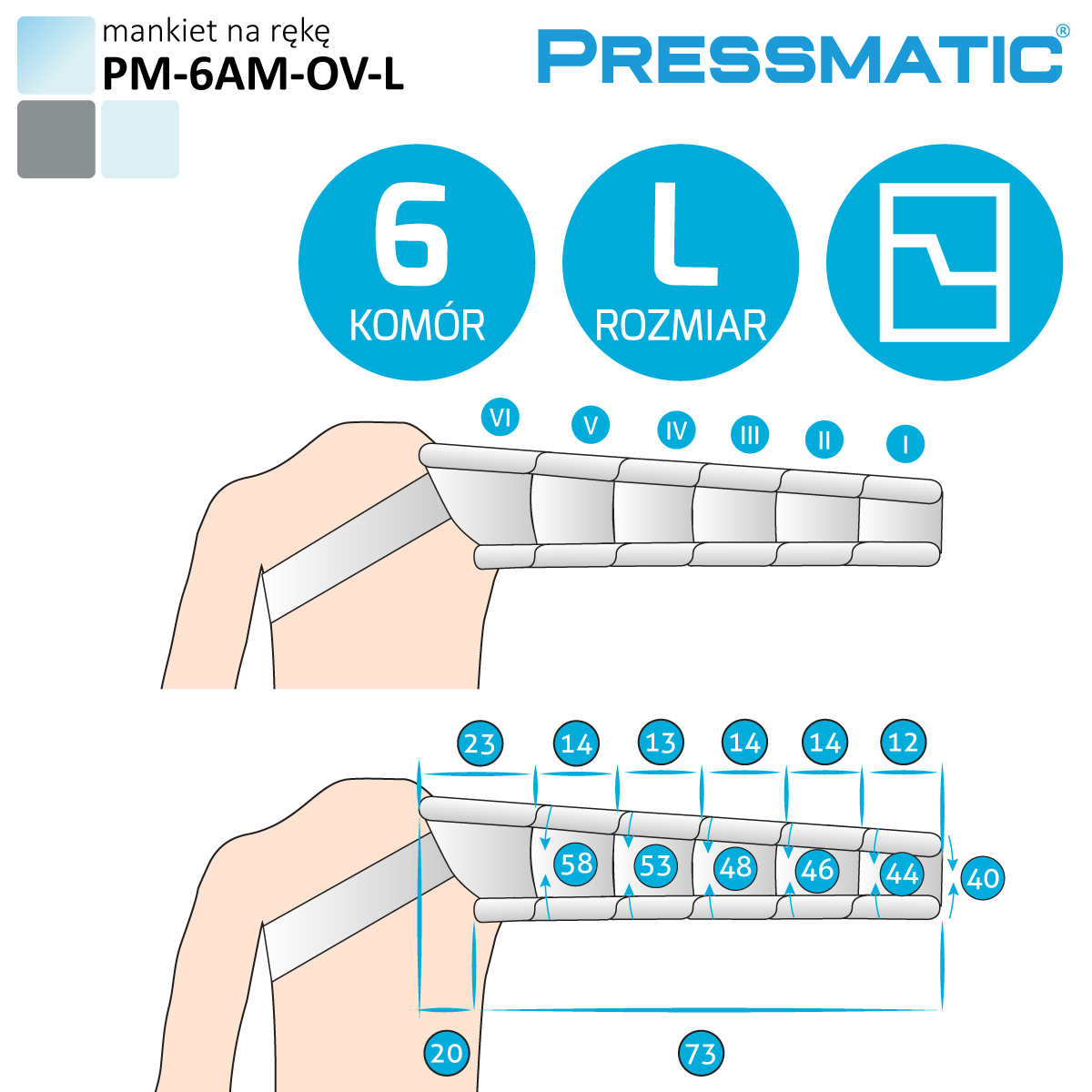 PRESSMATIC PM-6000A ist mit 6-Kammer-Manschetten kompatibel. Es verfügt über einen Betriebsmodus – aufsteigende Massage (Welle), d. h. sanfte Lymphdrainage. Das Pressotherapiegerät PRESSMATIC PM-6000A eignet sich vor allem für den Heimgebrauch als Therapie- und Vorbeugungsmethode gegen Ödeme.