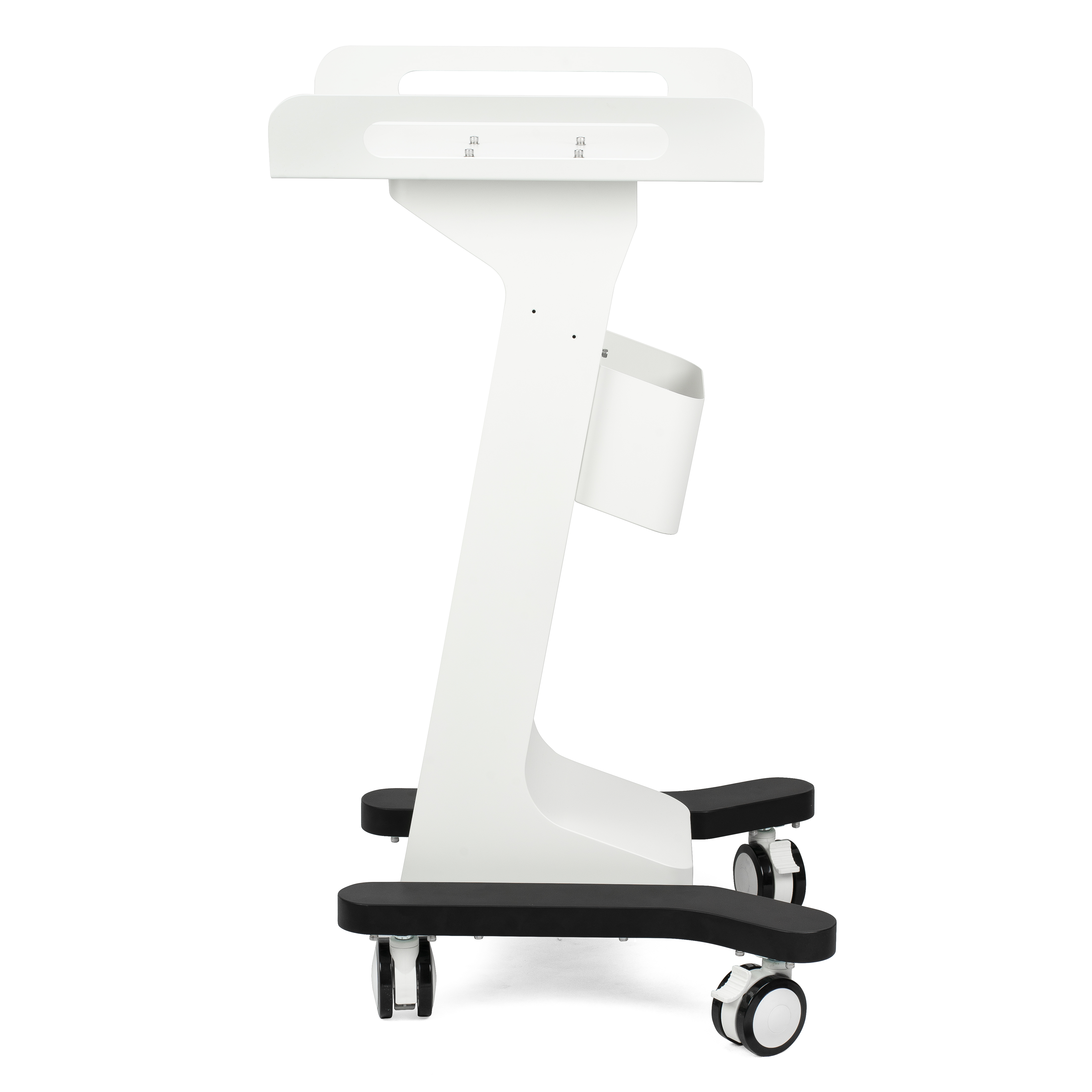 Massiver, mobiler Rollwagen – eine Hilfe für die Praxis, entwickelt für die bequeme Aufstellung und den sicheren Transport von Geräten (z. B. Behandlungsgeräte, Physiotherapie- und Kosmetikgeräte). Die pulverbeschichtete Stahlkonstruktion sorgt für Stabilität und einfache Reinigung, und die Lenkrollen erleichtern das Manövrieren auch in kleineren Räumen. Zwei Radbremsen stabilisieren den Wagen während der Arbeit mit dem Kunden.