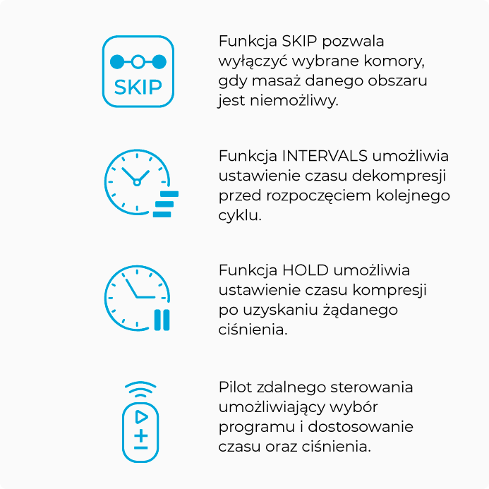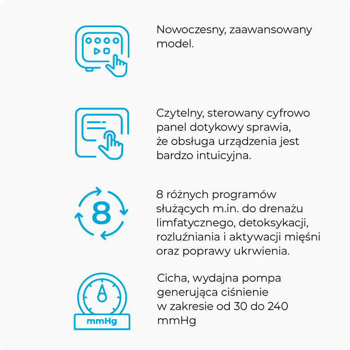 Dzięki różnym programom, umożliwia wykonanie nie tylko delikatnego zabiegu drenażu limfatycznego, ale też głębokiego masażu wpływającego na mięśnie. Z tego względu jest doskonały dla sportowców i dla osób cierpiących z powodu ciężkich, zmęczonych nóg.