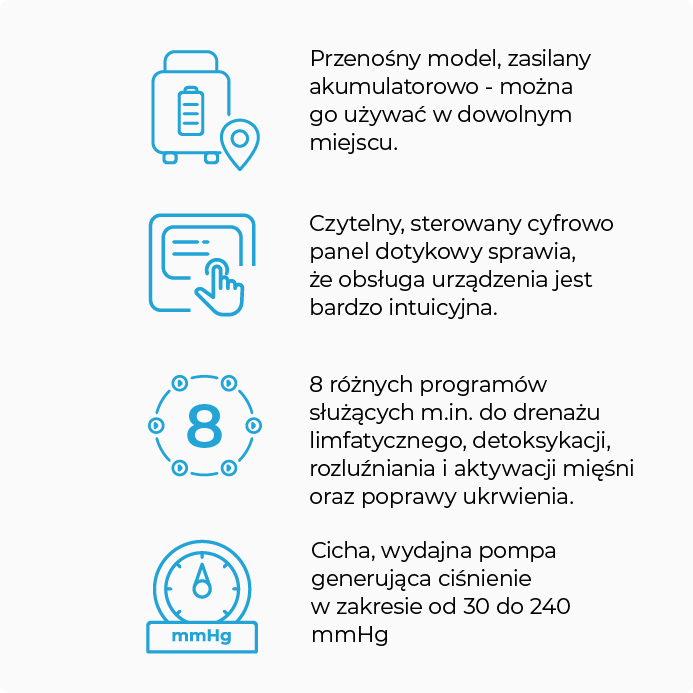 Z uwagi na przystępną cenę i łatwość w obsłudze polecany jest nie tylko dla profesjonalistów, ale także dla wymagających użytkowników domowych. Z uwagi na to, że aparat do presoterapii jest niewielki i zasilany akumulatorowo, szczególnie polecany jest osobom często podróżującym.