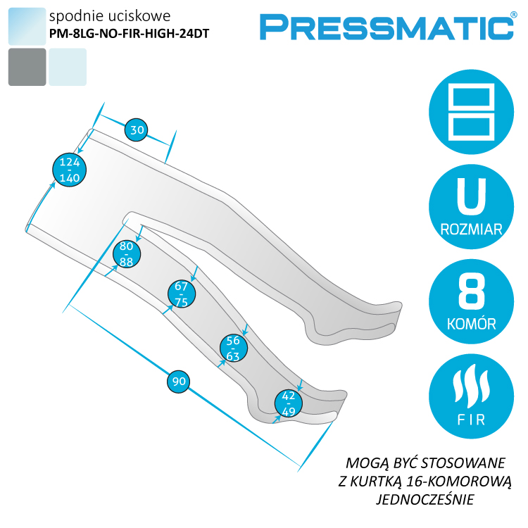 Spodnie uciskowe 8-komorowe są przeznaczone do stosowania z urządzeniem do presoterapii PRESSMATIC PM-24000DT. Należy je podłączyć do urządzenia wraz z 16-komorową kurtką. Spodnie uciskowe służą do drenażu limfatycznego nóg. Każda nogawka posiada 4 komory powietrzne. Przestrzeń od kroku wzwyż nie jest wyposażona w komory powietrzne – ten obszar ciała masowany jest przez kurtkę. Spodnie mogą być stosowane zarówno do zabiegów kosmetycznych, jak i do leczenia obrzęku limfatycznego, a także do rekonwalescencji sportowców. Spodnie uciskowe posiadają promienniki światła podczerwonego, więc oprócz presoterapii, można stosować termoterapię FIR. Rozmiar spodni jest uniwersalny i można go indywidualnie dopasować do każdego. W tym celu posiadają system zamków błyskawicznych i pasów ściągających.