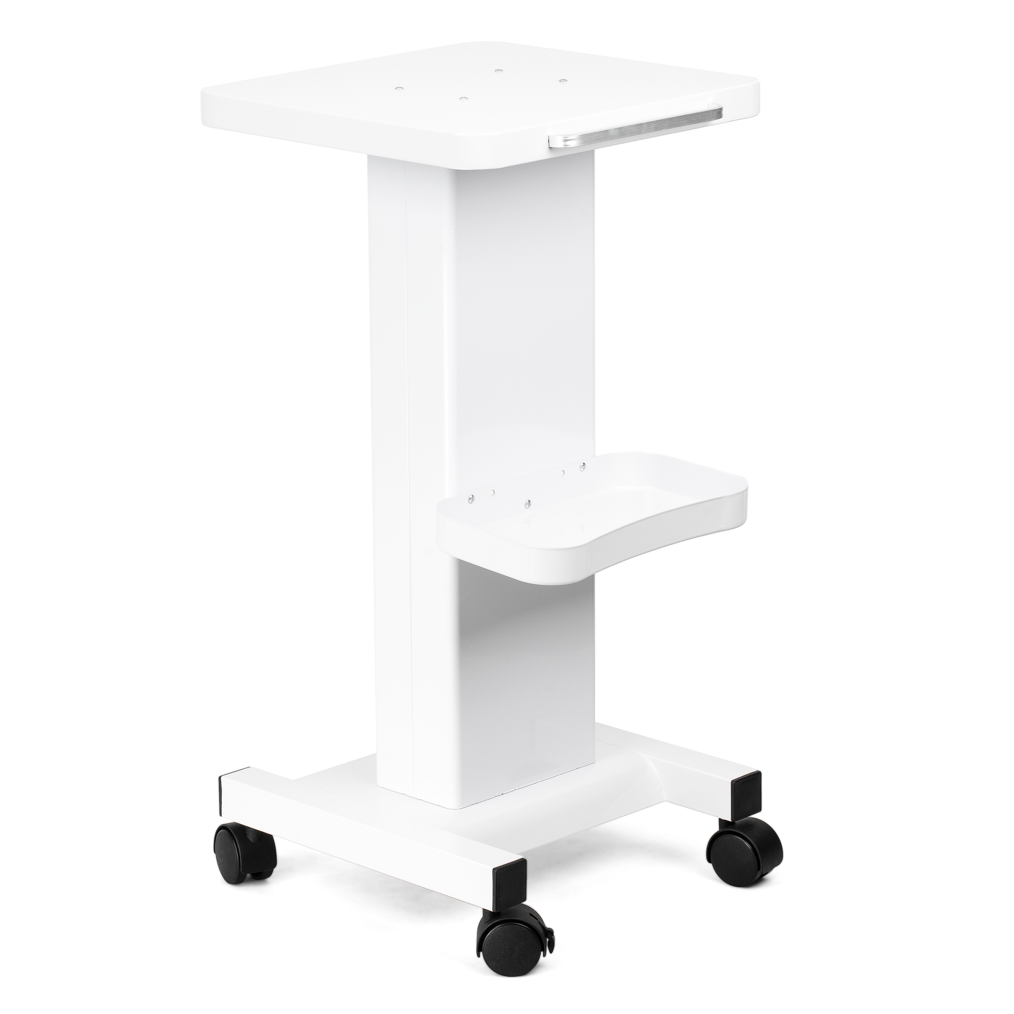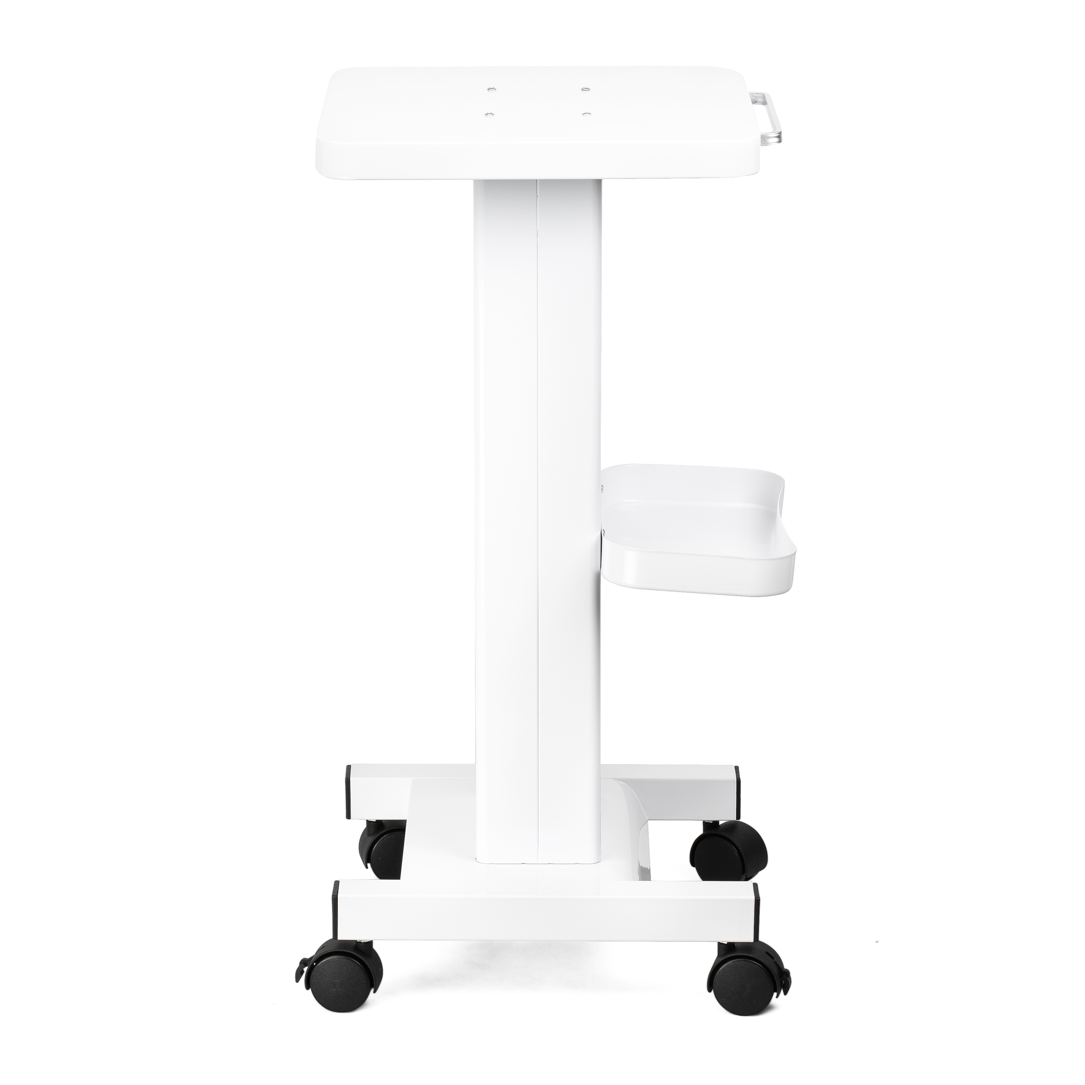 Kompaktowy mobilny stolik/wózek pomocniczy do gabinetu, wykonany w całości ze stali malowanej proszkowo. Wyposażony w obrotowe kółka oraz uchwyt zintegrowany z górną półką, co ułatwia bezpieczne przemieszczanie aparatu. Dwie blokady kół stabilizują wózek podczas pracy.